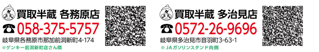 各務原市、関市、岐南町、多治見市、可児市など、お住まいの近くで気軽に立ち寄れるのが買取半蔵の強みです。 「今の価格だけ知りたい」というお問い合わせも大歓迎!予約不要ですので、お買い物ついでにぜひお立ち寄りください。