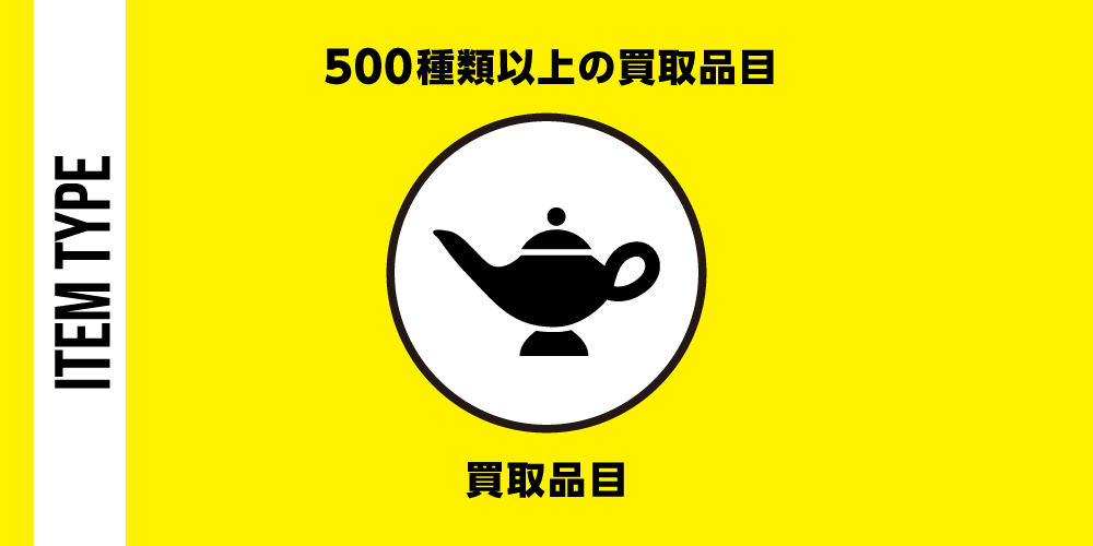 | その他 | 洋酒、古銭、記念硬貨、勲章、刀剣、茶道具、絵画、骨董品、楽器、カメラ、家電、ゲーム機、フィギュア、おもちゃ、鉄道模型など |
